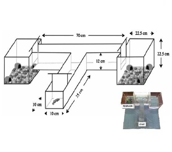 There is a 22.5 Â 22.5 Â 22.5 cm reservoir at each end of the cross piece, with 1 cm of gravel, 3 shelters, and water 14.5-cm deep. There was an opaque partition at the entrance to each reservoir and 10 cm away from the end of the down piece of the T-maze. Dimensions Starting Arm 35 cm L&R Arms 35 cm Hgt 12 cm 22.5 cm Reservoir