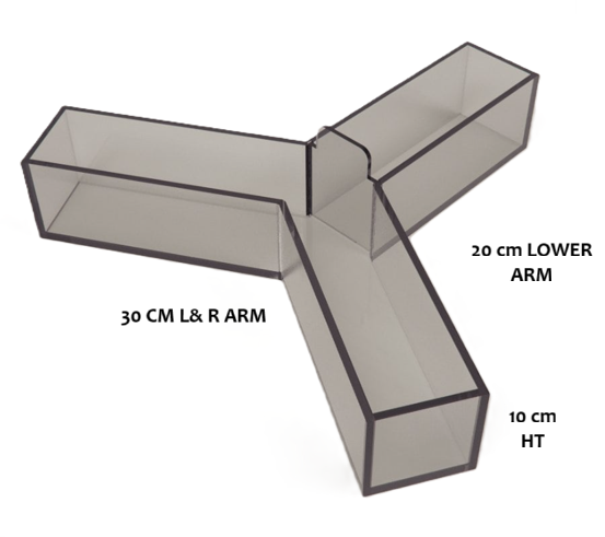The T-maze is a classic behavioral test apparatus used primarily to assess learning, memory, spatial navigation, and decision-making in laboratory animals such as zebrafish, rodents, and other small vertebrates.Dimensions Starting Arm 30 cm L&R Arms 20 cm Hgt 10 cm